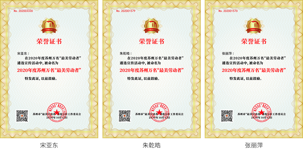 熱烈祝賀我公司三名同志:宋亞東、朱乾皓、張麗萍榮獲——2020年度蘇州萬名“最美勞動者”!